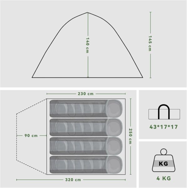- Camping tent: Expanding size: 320*250*145cm (bedroom: 230*250*145cm), storage size: 43*17*17cm. Product weight: 4KG Large space, small package, easy to carry.