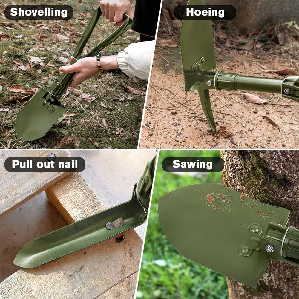 • 【Compact Structure & High Performance】The size of the camping shovel is 18.5inch long, 4.72inch wide, only 7.5inch after folding; used for emergency as well as camping tools or gardening, digging, shoveling, sawing, chopping and digging pits; in addition, the shovel is equipped with a nylon bag, light weight and easy to store